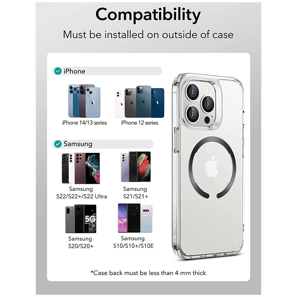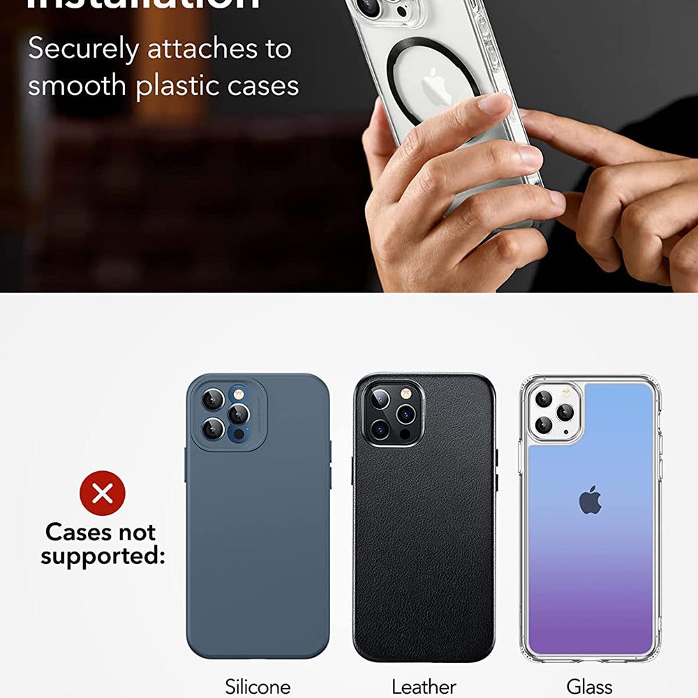 • Do you prefer a certain case model, but it doesn't have a MagSafe ring? No problem. You can attach it yourself. Order the ESR magnetic ring and have the freedom to choose the case you want.