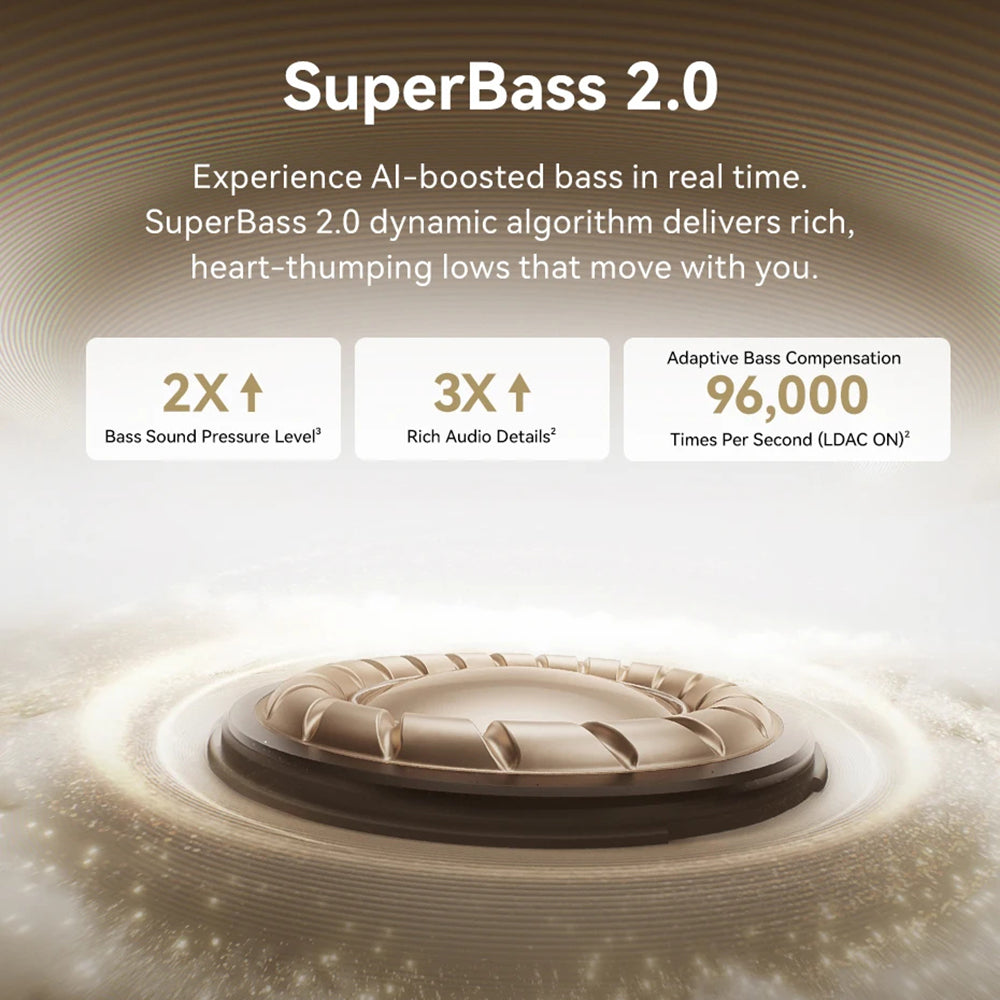 Αυτή η διάταξη παράγει μια ευρεία ηχητική σκηνή, ενώ ο ιδιόκτητος αλγόριθμος SuperBass 2.0 (AI) προσαρμόζει σε πραγματικό χρόνο την ενέργεια των μπάσων.