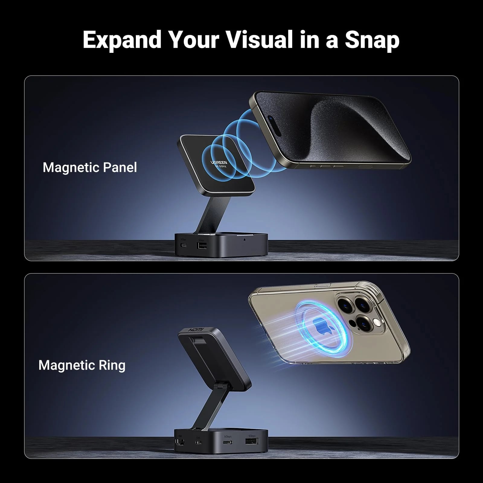 Εξοπλισμένο με ένα ισχυρό μαγνητικό σύστημα 9N και ένα αφιερωμένο μαγνητικό δαχτυλίδι, το hub στερεώνεται σταθερά και ασφαλώς στις συμβατές συσκευές,